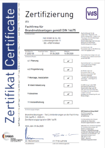 An dieser Stelle finden Sie Zertifikate für das Informationssicherheitsmanagementsystem ISO 27001:2017, das Qualitätsmanagementsystem ISO 9001:2015, die Anerkennung als Fachfirma für Brandmeldeanlagen gemäß DIN 14675, die Anerkennung als Errichterunternehmen für Gefahrenmeldeanlagen, die Anerkennung für den Explosionsschutz nach ATEX und außerdem die Anerkennung als Fachbetrieb gemäß Wasserhaushaltsgesetz. Außerdem sind wir zertifizierter Janitza Solution Partner, Siemens Solution Partner im Bereich Automation Drives und SIVACON Technology Partner.
